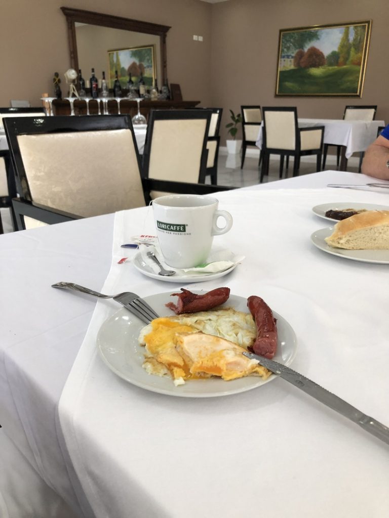 Zaczynamy go od śniadania. Jak się okazało hotel został oddany do użytku 3 miesiące temu. Trochę cygańskie klimaty ale czysto schludnie, pachnąco i z klimatyzacją. Dodam, że za cały nasz pobyt w tym śniadanie i kolacja + piwo zapłaciliśmy za dwie osoby chyba 42E.