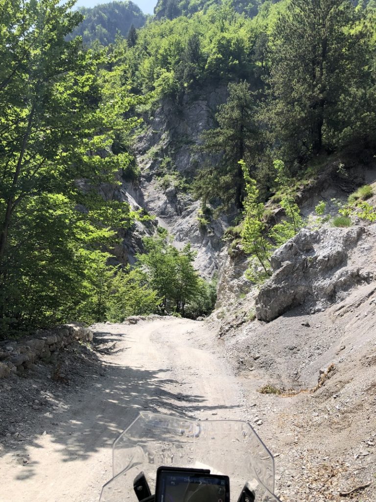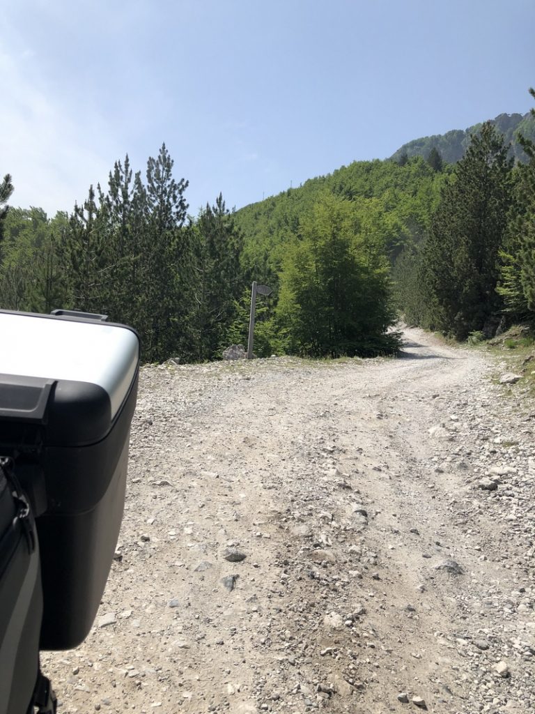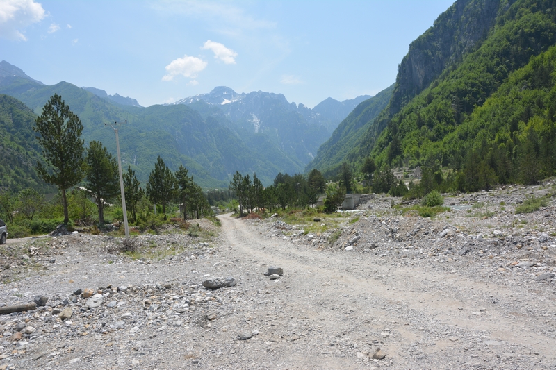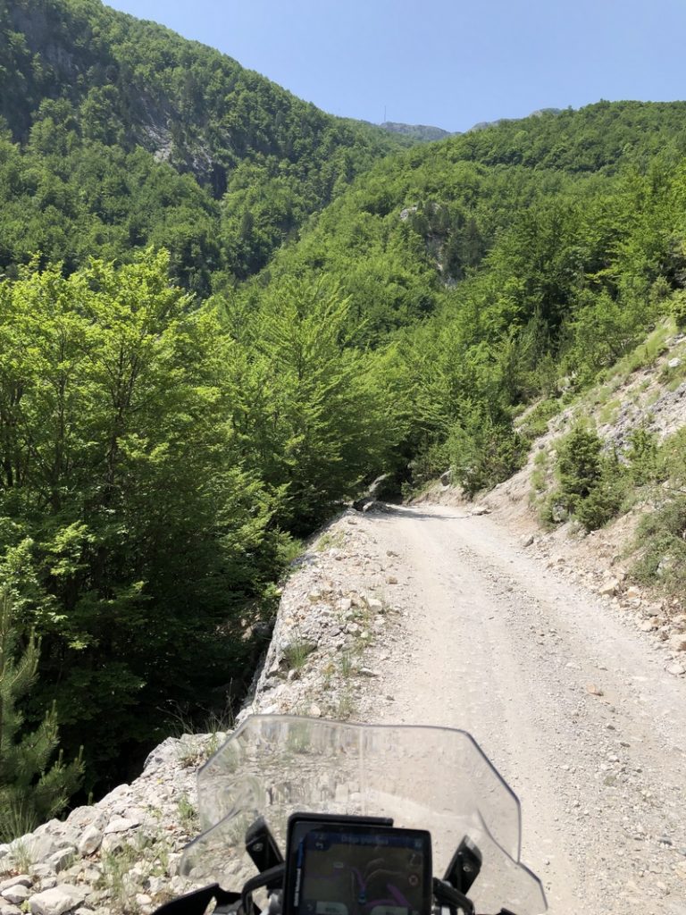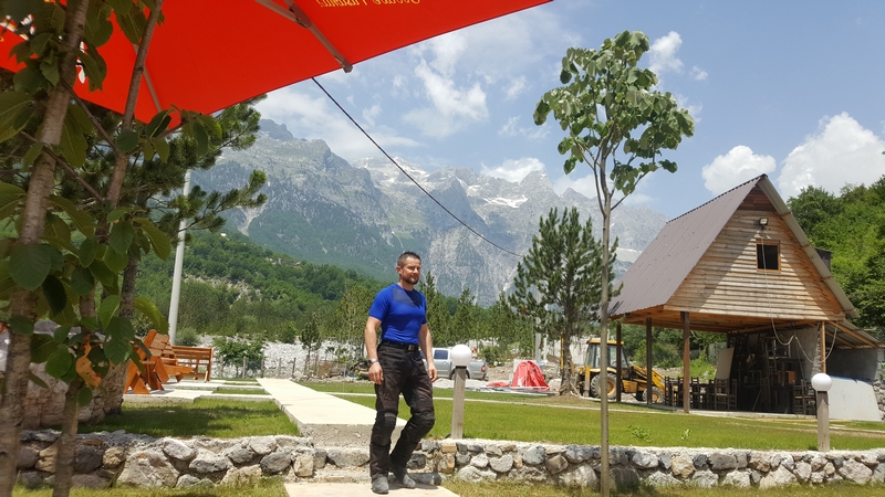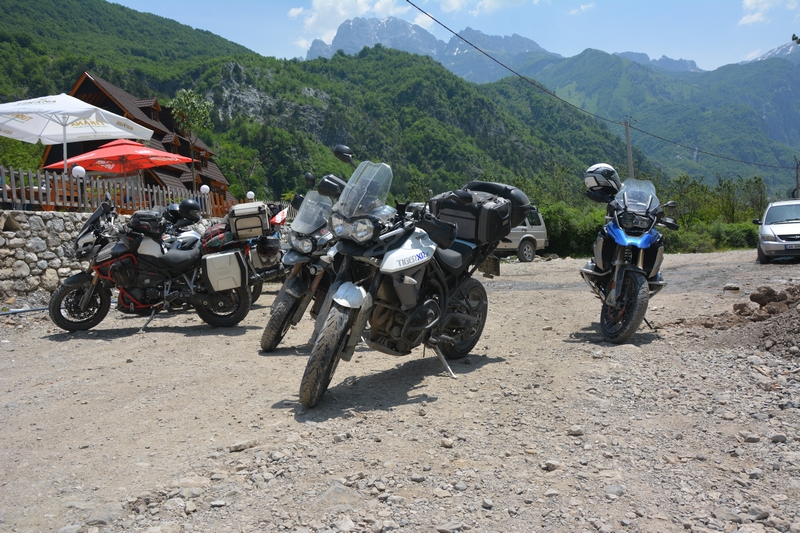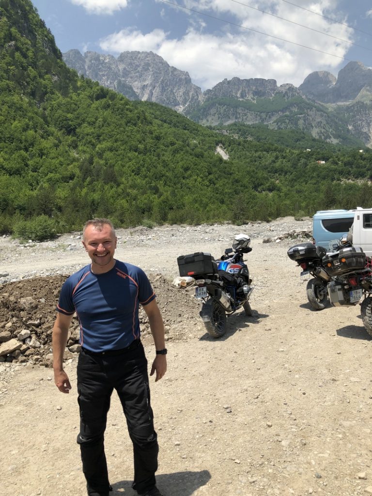 Ponieważ droga była jedna więc ja ruszyłem pierwszy a Darek jeszcze konwersował. Tuż przed samym Theth na rozdrożu pojawił się znak “Theth coś tam” po albańsku. Pomyślałem, że to inna ścieżka do Theth wiec pojechałem za znakiem. To nie był dobry pomysł, ale odwrotu nie było, trzy strumyki pokonałem ale czwarty miał z 10m no i kończył się piaseczkiem, w którym mój motocykl postanowił utknąć. Chwilę zajęła mi walka przy +40 stopniach z 300kg moto. Ale udało się i do Theth dotarłem, gdzie Darek z ludkami z Oławy popijał już zimną cole. Odpoczęliśmy no i niestety trzeba było wracać tą sama drogą.