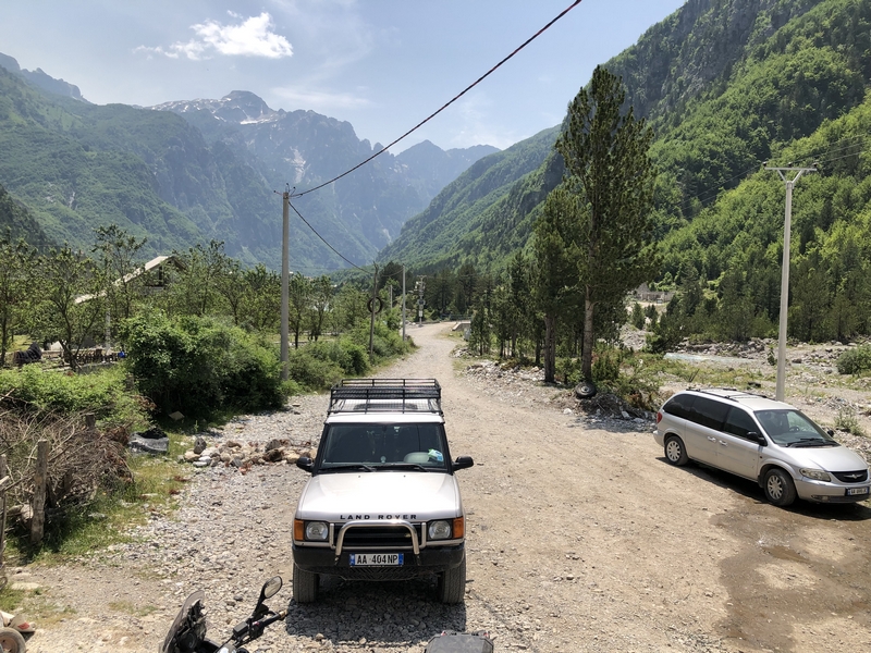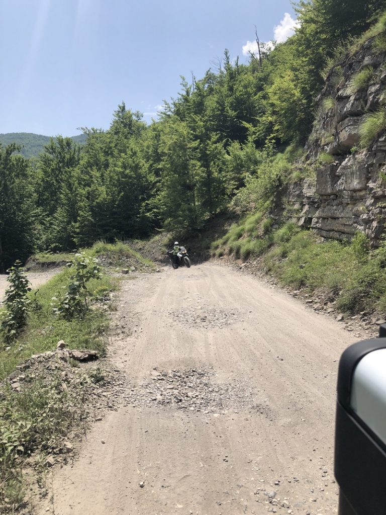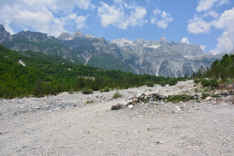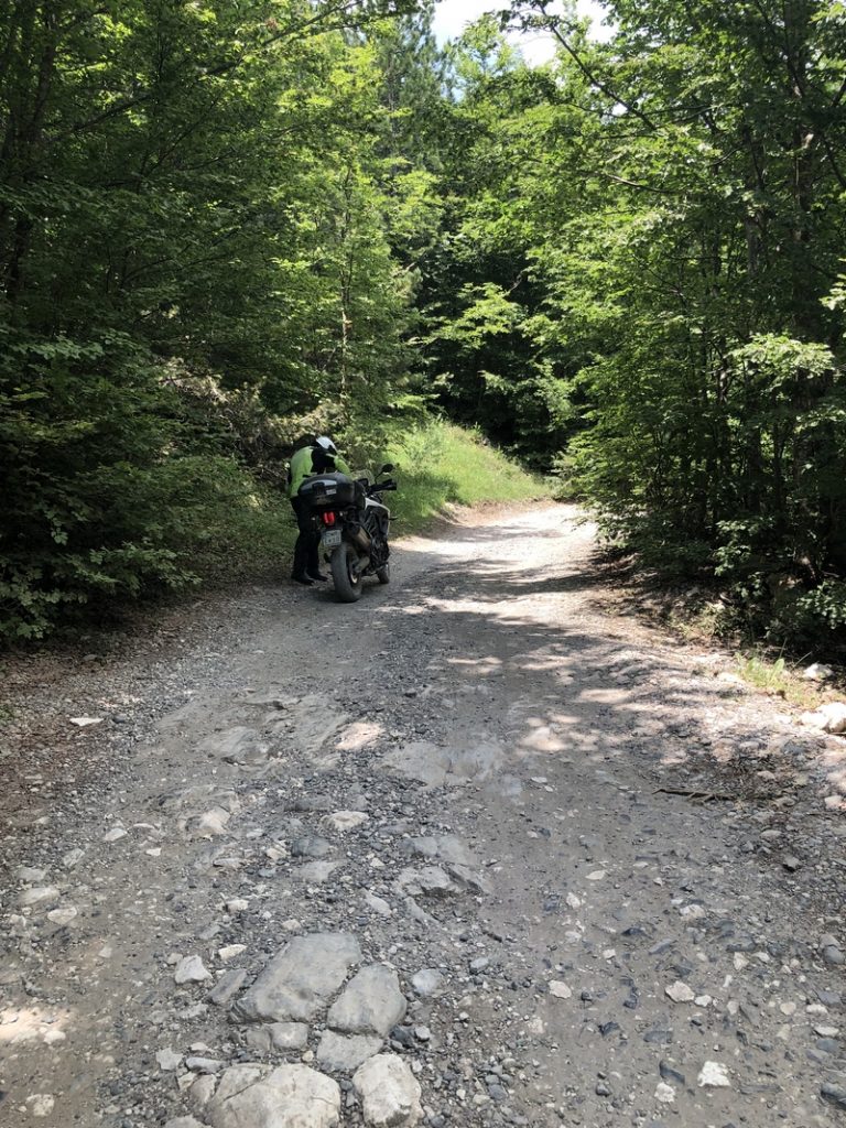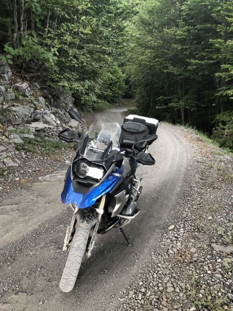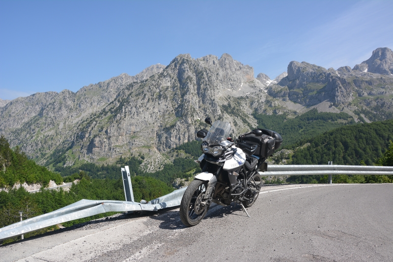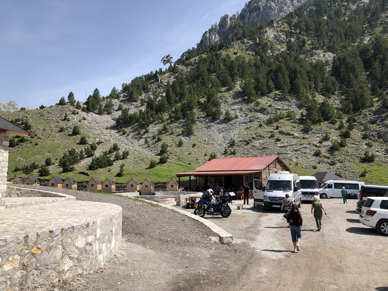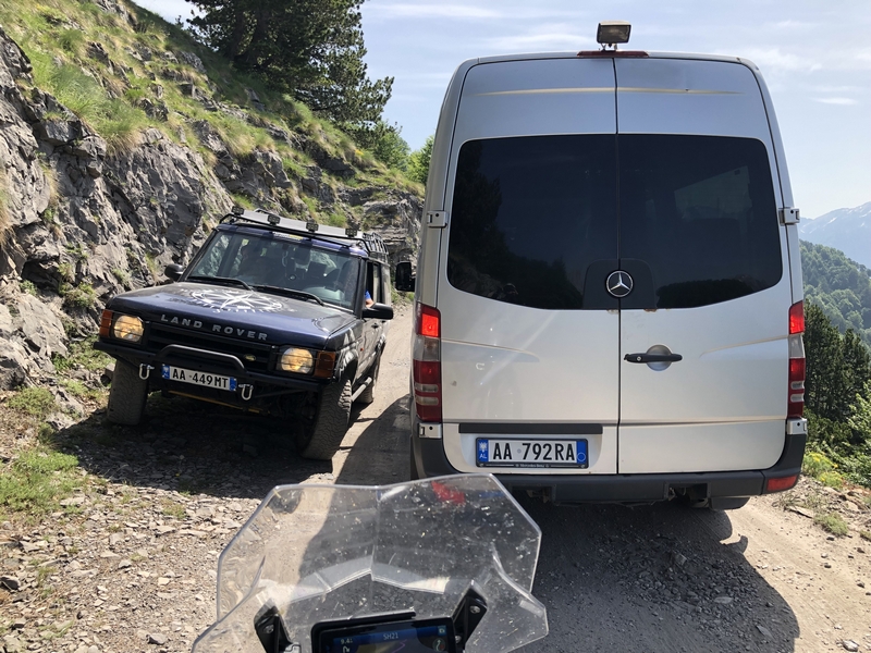 Ponieważ droga była jedna więc ja ruszyłem pierwszy a Darek jeszcze konwersował. Tuż przed samym Theth na rozdrożu pojawił się znak “Theth coś tam” po albańsku. Pomyślałem, że to inna ścieżka do Theth wiec pojechałem za znakiem. To nie był dobry pomysł, ale odwrotu nie było, trzy strumyki pokonałem ale czwarty miał z 10m no i kończył się piaseczkiem, w którym mój motocykl postanowił utknąć. Chwilę zajęła mi walka przy +40 stopniach z 300kg moto. Ale udało się i do Theth dotarłem, gdzie Darek z ludkami z Oławy popijał już zimną cole. Odpoczęliśmy no i niestety trzeba było wracać tą sama drogą.