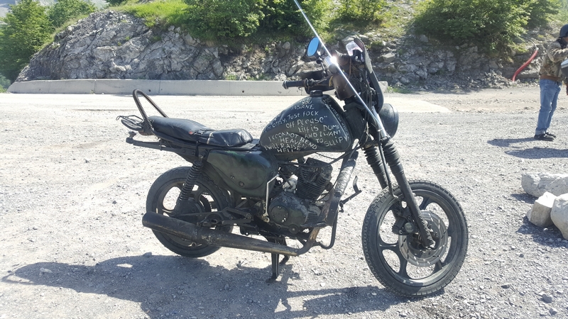 I tu się skończył asfalt. Spotykamy lokalesa, który zbudował swój motocykl z tego co znalazł.