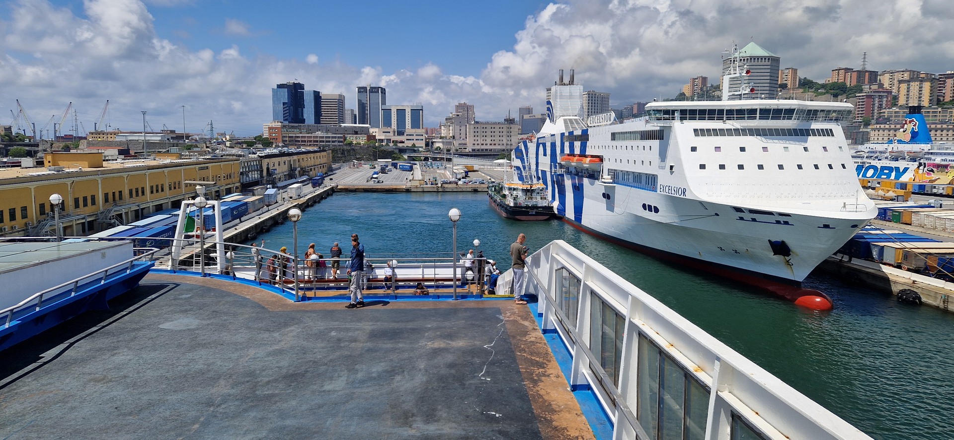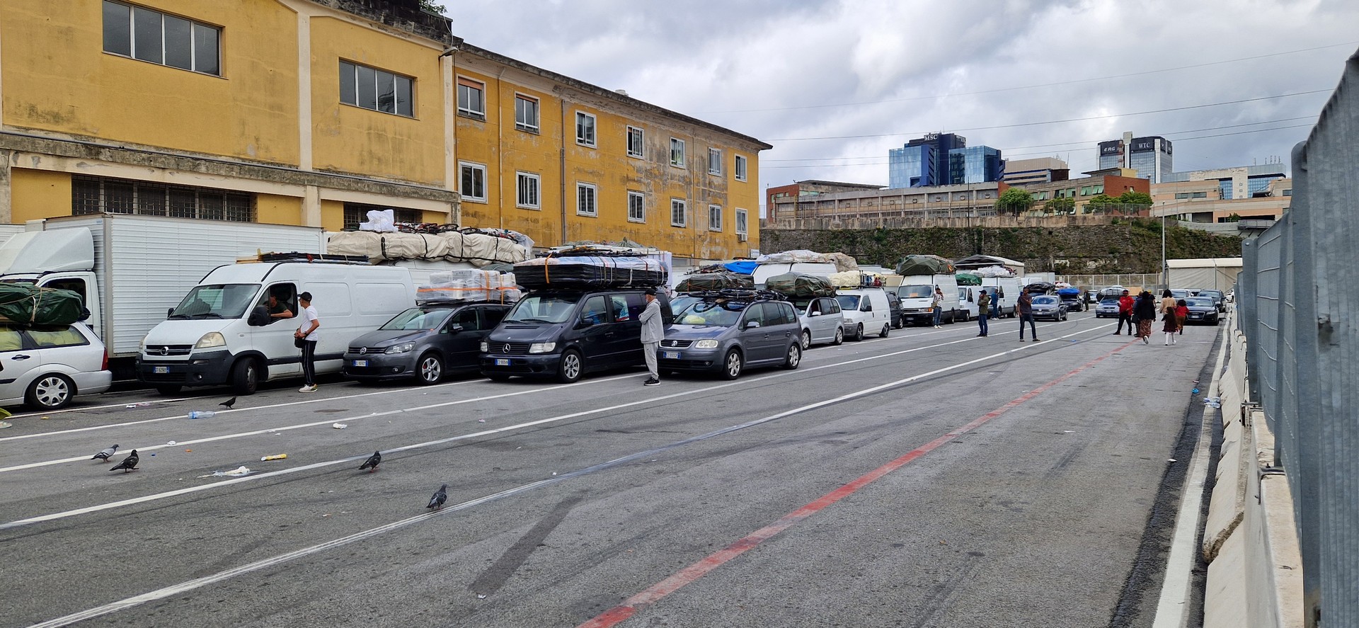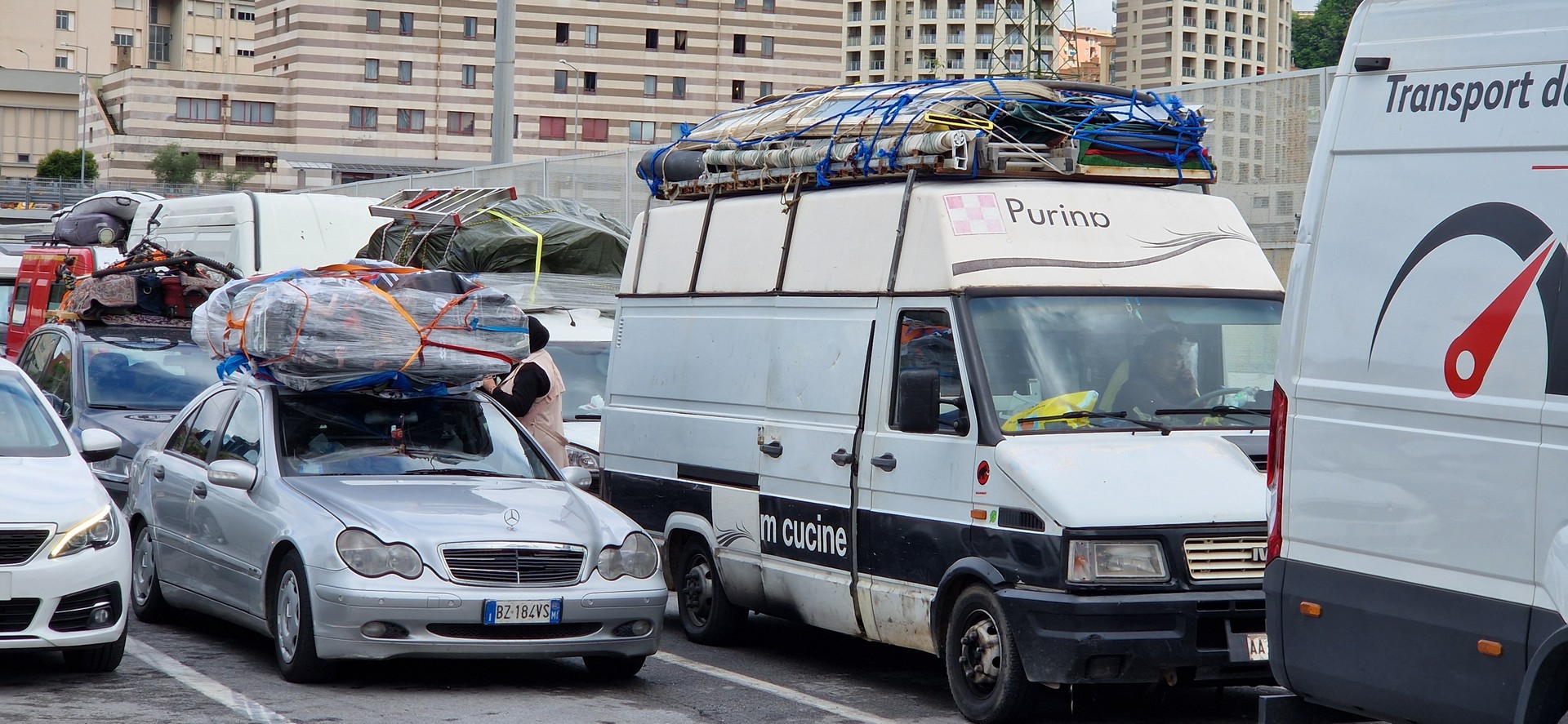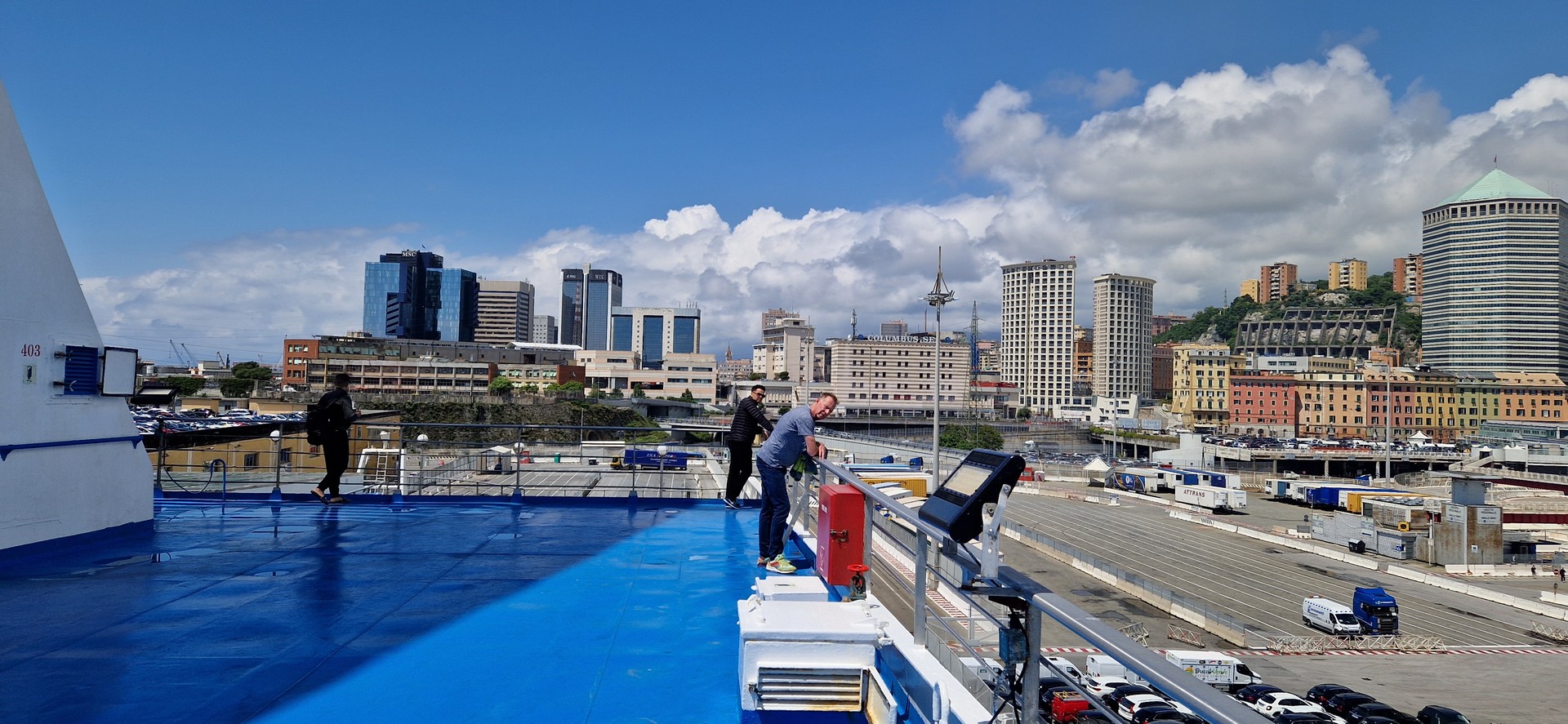 W porcie w Genua jak zwykle przy zakupie biletów był kabaret. Dopiero za trzecim razem kasjerka wyklikała i wydrukowała poprawne bilety. A przed promem już trochę afrykańskich klimatów.